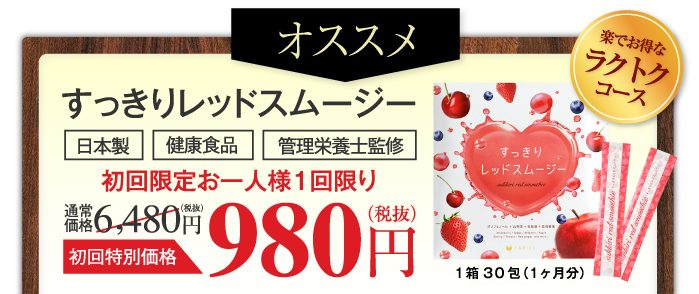 すっきりレッドスムージーの公式サイトでは少し高値の6480円で単品購入するか、初めて利用する方限定ですが初回が980円と超格安で購入できる定期コースのどちらかを選択することになります。