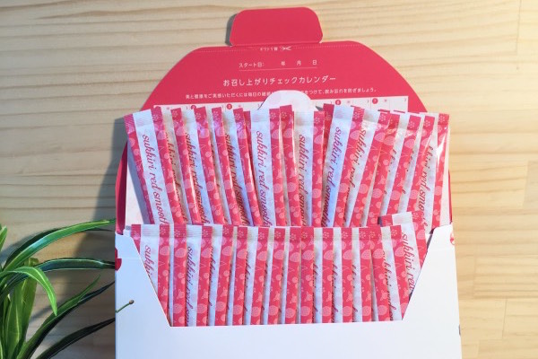 蓋を開けるとすっきりレッドスムージーの粉末が入ったスティック状の袋がぎっしり詰まっています。