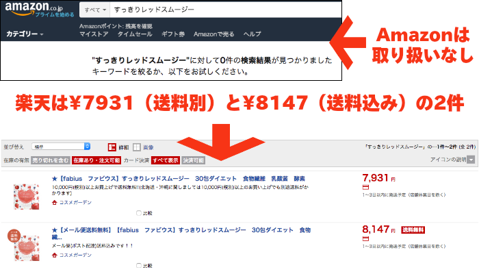 上記の表にまとめていますが、まずamazonにはすっきりレッドスムージーの取り扱いはありませんでした。残る楽天の方には2点の取り扱いがありましたが、公式サイトで単品購入する以上の高値となっています。そのため、すっきりレッドスムージーは公式サイトで購入するのがもっとも安く手に入れる方法ということになります。
