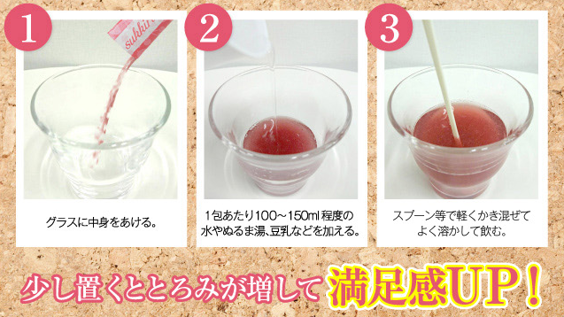 早速すっきりレッドスムージーを飲んでみたいのですが、スティックには作り方が書いておらず、パッケージにも「1日1〜2包を目安に、1袋に100ml程度の冷水やぬるま湯、豆乳などに混ぜてお召し上がりください。」とかなり大雑把にしか書かれていません。すっきりレッドスムージーの効果を最大限に引き出すためもまずは基本となる正しい飲み方を調べてみると公式サイトに下記のように書かれていました!