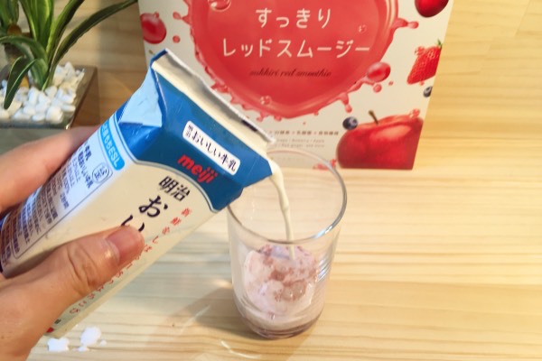 ちょうど冷蔵庫に小さい200mlパックの牛乳がありましたのですっきりレッドスムージー2包を使って作ってみます。この大きさの牛乳は普通ストローで飲むものであるためか、綺麗にコップに移すことができずこぼしてしまいました…汗