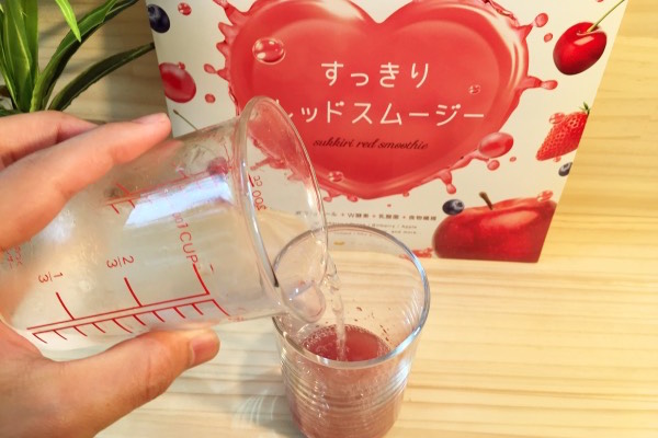 - グラスにすっきりレッドスムージーの粉末を1〜2袋入れる。