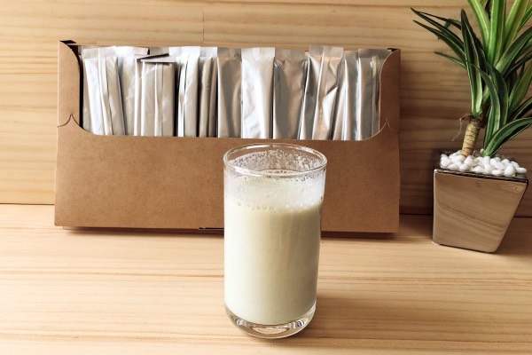 マジカルスムージーの粉末をさらに出してみます。この銀色の包装紙が思ったより優秀で切れ目が入っていないのにどこからでもスッと切れてかなり楽ちんでした。