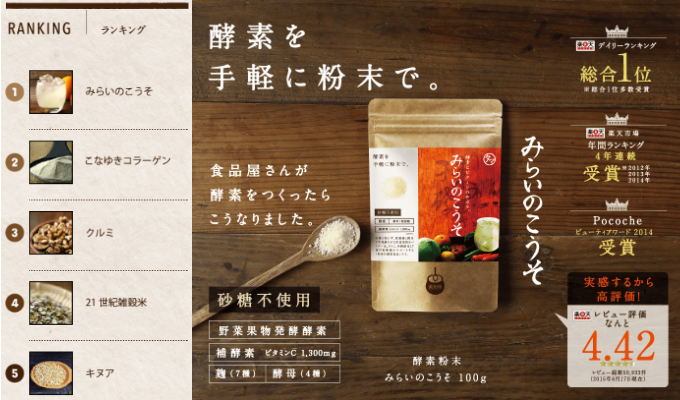現在公式サイトで母なるスムージーを購入すると管理人と同じ「みらいのこうそ」というおまけが付いてきます。「みらいのこうそ」はタマチャンショップのショップ内ランキングで1位を獲得している人気商品です。また、母なるスムージーとの相性もよく口コミでは母なるスムージーに混ぜると飲みやすくなるという意見が多く見られました。