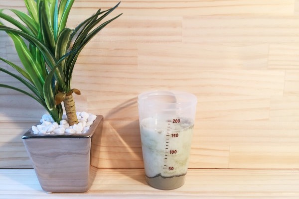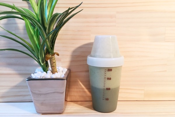 作り方の通りシェーカーに付属スプーン1杯分の母なるスムージーの粉末を入れ、牛乳を150cc注ぎます。