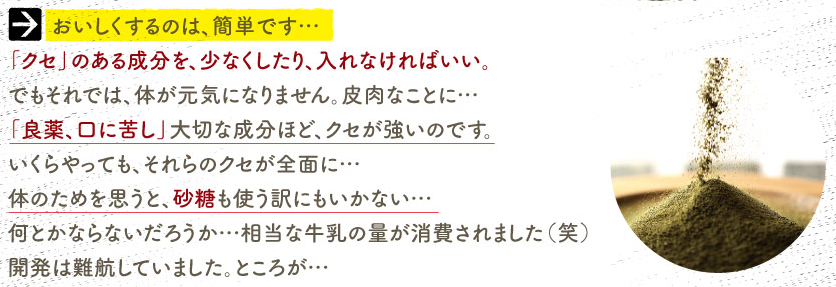 母なるスムージーは通常の材料を発酵→乾燥させる行程を風味を飛ばすものと風味を残すものに分けて作ってあります。これにより癖のある材料の癖だけを抜き取ることに成功しているようです。一般的な粉末のグリーンスムージーの場合はこれらを一緒にし、人工甘味料と香料で味付けというのがセオリーです。タマチャンショップはこの味を出すのに思っていたより頑張っていたことがわかりました。笑