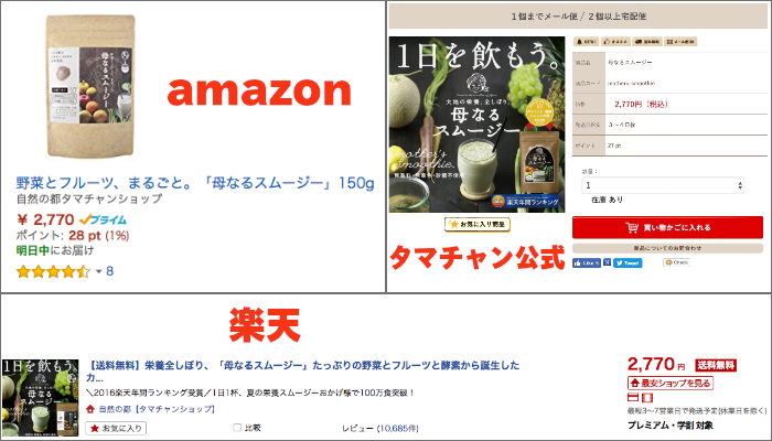 母なるスムージーの最安値を探していたところなんとamazonでも楽天でも公式サイトでも全て一律の値段でした!しかもよくよく見ると全て「タマチャンショップ」という同じショップ名です。要はamazonでも楽天でも全て公式サイトのタマチャンショップが運営しているショップということです。