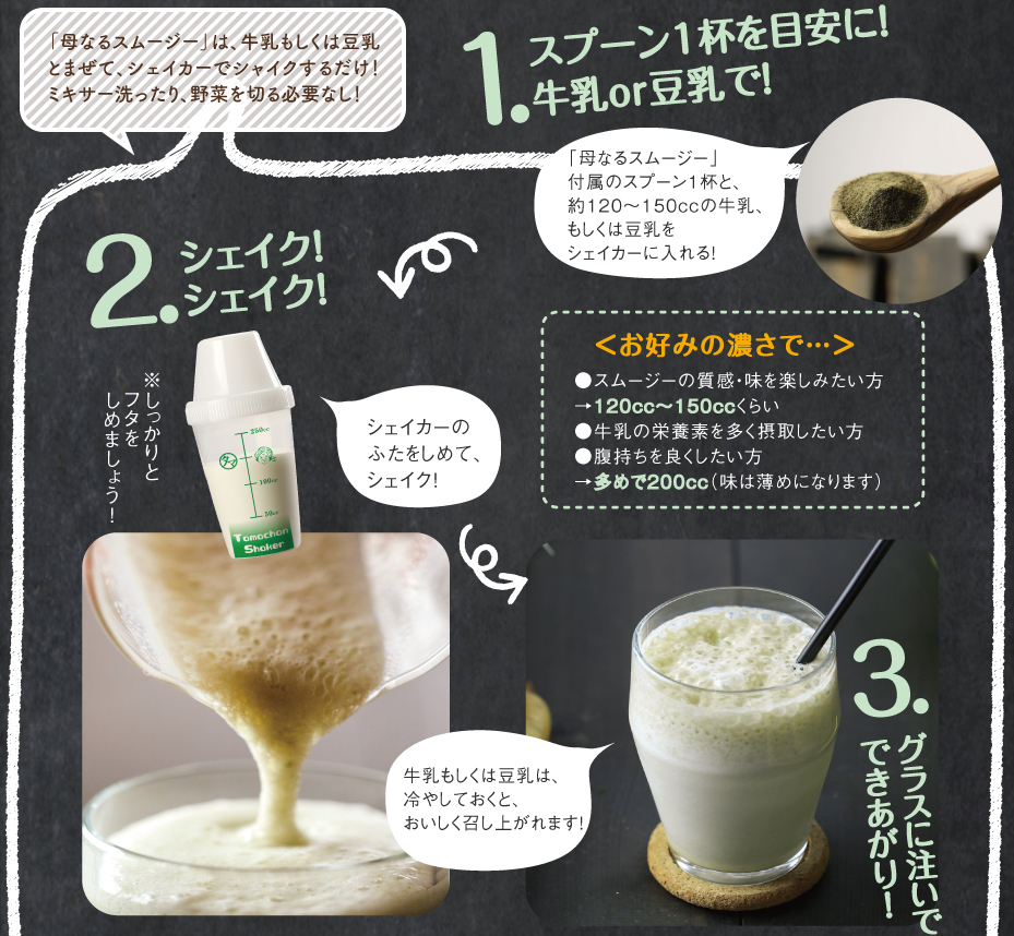 この母なるスムージーの行程は通常粉末のスムージーを作る行程に置き換えると2商品分作る作業が行われているため、とりあえずメーカーの必死の企業努力の結果この味にまとまったようです。