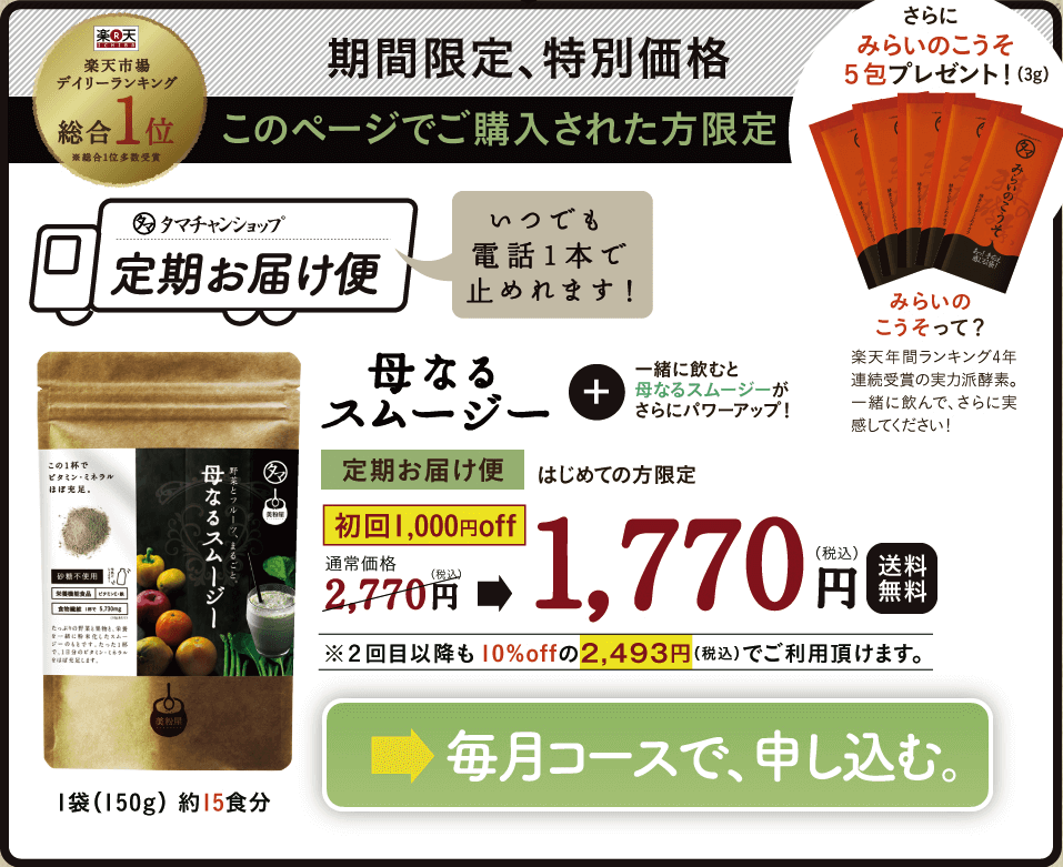 なんと母なるスムージーは上記サイトの「期間限定特別価格」と書かれたページから申し込むと通常2770円の所を1000円引きの1770円で購入することができます!しかも、2回目以降も10%OFFの2493円で購入することができるためかなりお得です。